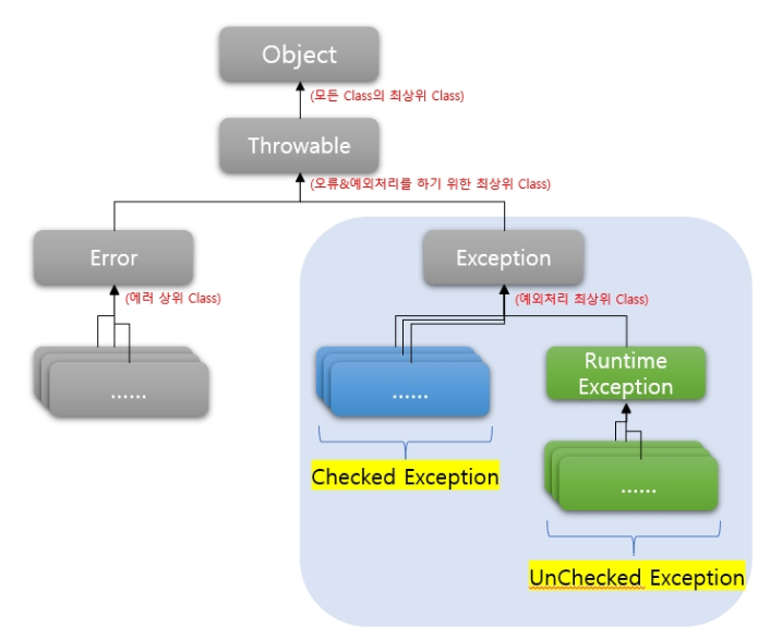 | 처리 여부 | 반드시 예외 처리 필요 | 명시적 처리를 강제하지 않음 |