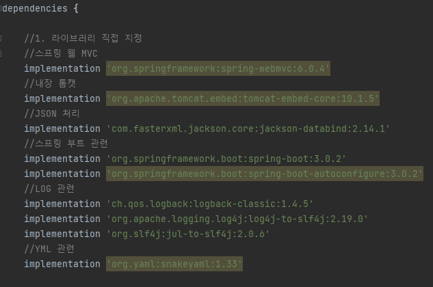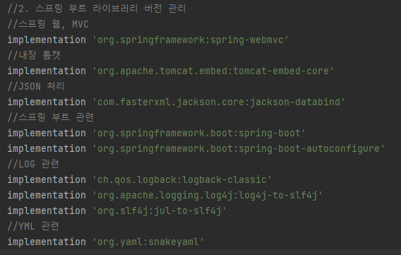 - 스프링 웹 MVC, 내장 톰캣, JSON 처리, 스프링 부트 관련, LOG, YML 등