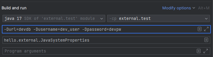 java -Durl=devdb -Dusername=dev_user -Dpassword=dev_pw -jar app.jar