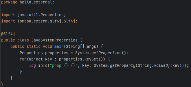 - System.getProperties() : Map 과 유사한 key=value 형식의 Properties를 받을 수 있음