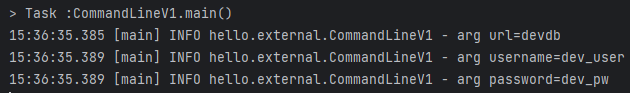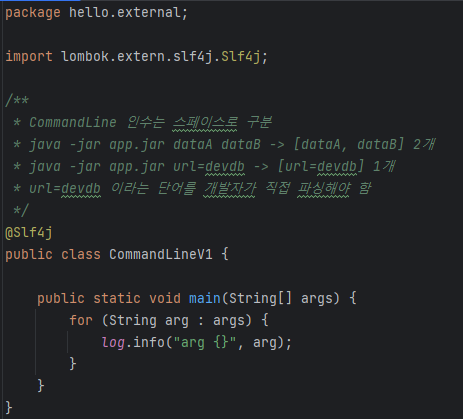 커맨드 라인 인수 (Command line arguments) 는 애플리케이션 실행 시점에 외부 설정값을 main(args) 메서드의 args 파라미터로 전달하는 방법