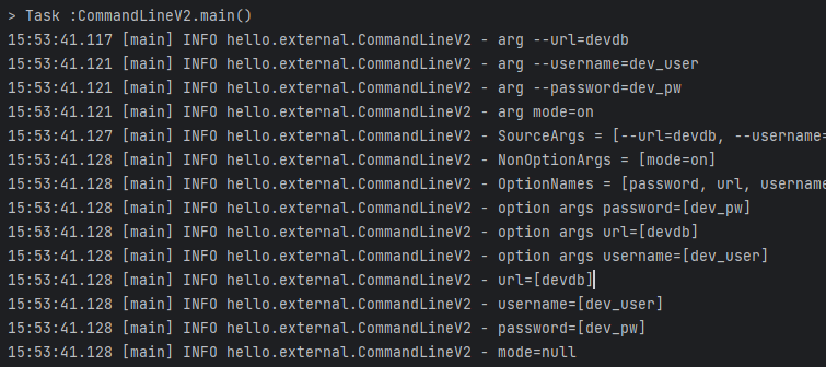- NonOptionArgs = [mode=on] : 옵션 인수가 아님. key=value 형식으로 파싱되지 않음. -- 를 앞에 사용하지 않음