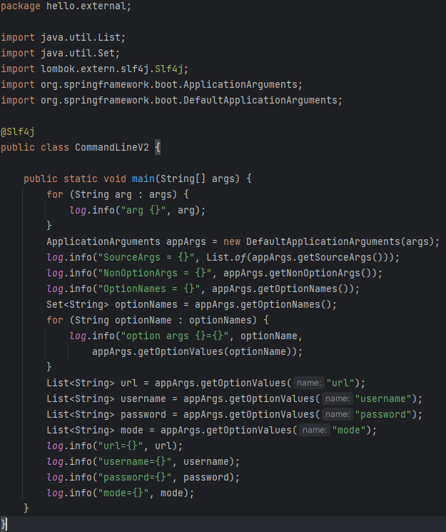 - url , username , password 는옵션 인수이므로 appArgs.getOptionValues(key) 로 조회 가능