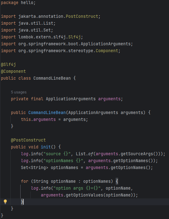 스프링 부트는 커맨드 라인 옵션 인수를 활용할 수 있는 ApplicationArguments 를 스프링 빈으로 등록 ➡️ 입력한 커맨드 라인 저장 ➡️ 해당 빈을 주입 받으면 커맨드 라인으로 입력한 값은 어디서든 사용 가능