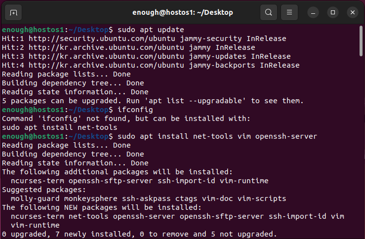 sudo apt install net-tools vim openssh-server : net-tools설치