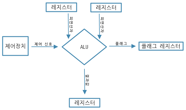ALU는 피연산자를 받아들이고, 제어장치로부터 수행할 연산을 알려주는 제어 신호를 받아들임. ALU는 레지스터와 제어장치로부터 받아들인 피연산자와 제어 신호로 산술 연산, 논리 연산 등 다양한 연산을 수행함