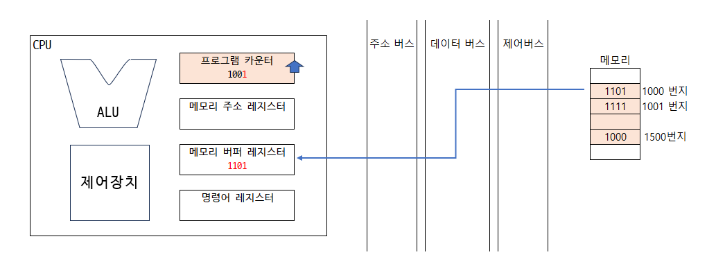 5. 메모리 1000번지에 저장된 값은 데이터 버스를 통해 메모리 버퍼 레지스터로 전달되고, 프로그램 카운터는 증가되어 다음 명령어를 읽어 들일 준비를 함