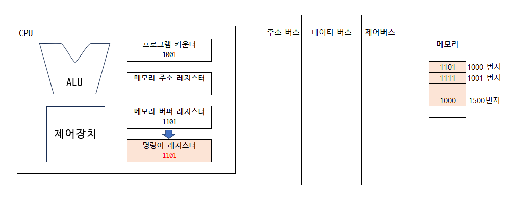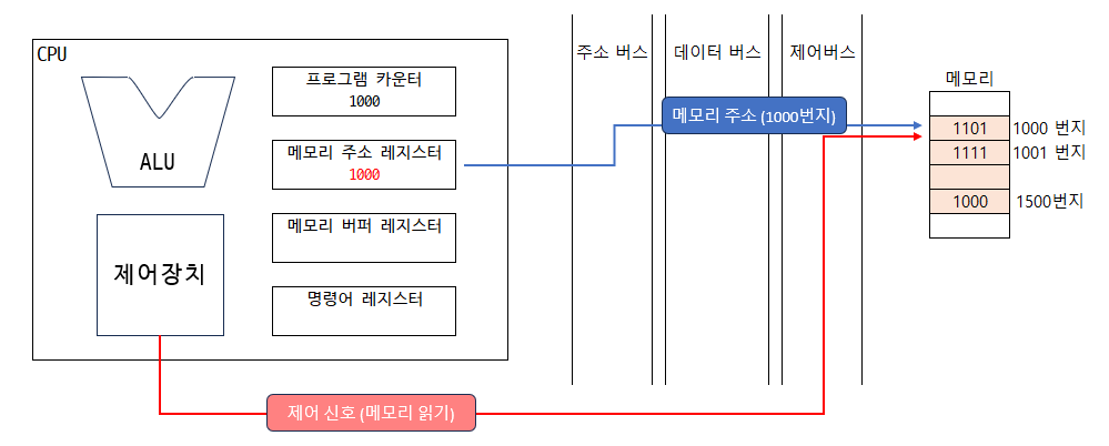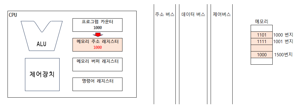 3. 1000번지를 읽어 들이기 위해서 주소 버스로 1000번지를 내보내야함 ➡️ 메모리 주소 레지스터에는 1000이 저장됨