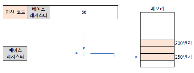 베이스 레지스터에 200이라는 값이 있고 오퍼랜드가 50이라면 250번지로 접근함