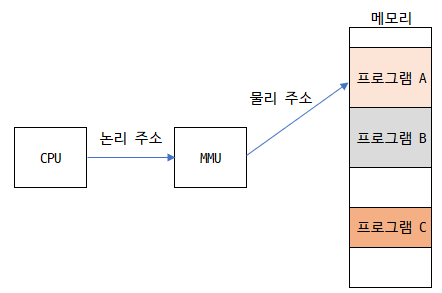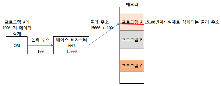 MMU는 CPU가 발생시킨 논리 주소에 베이스 레지스터 값을 더하여 논리 주소를 물리 주소로 변환함