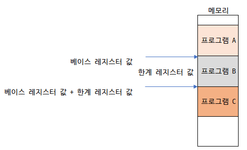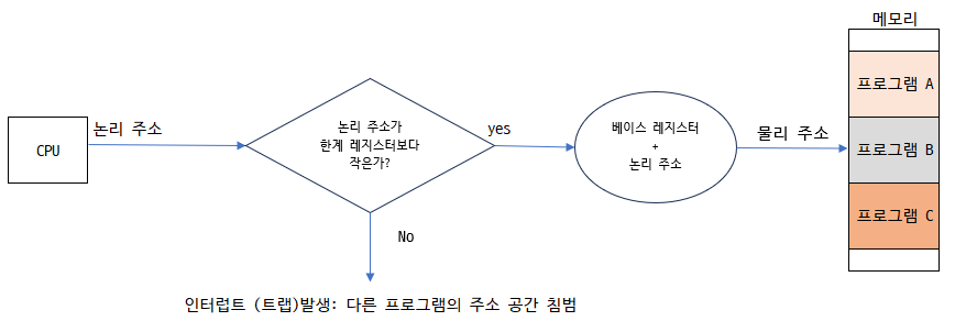 CPU가 한계 레지스터보다 높은 논리 주소에 접근하려고 하면 인터럽트 (트랩)을 발생시켜 실행을 중단함