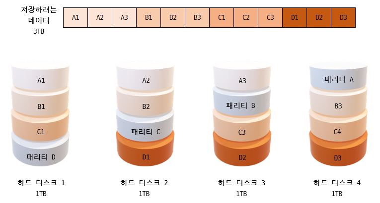 데이터를 저장할 때 각 하드 디스크는 아래와 같이 번갈아 가며 데이터를 저장함