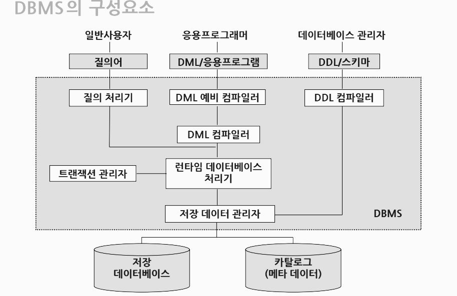DBMS 정의 데이터베이스와 DBMS의 차이에 대해서 설명해 보세요 DBMS의 주요 기능은 무엇이 있을까요? DBMS의 주요 구성요소에 대해서 설명해 보세요 데이터베이스와 DBMS 의 차이는? 데이터베이스: 데이터의 저장소, 데이터를 통합 저장하고 운영하는 집합체 DBMS: 데이터베이스를 생성하고, 효율적으로 관리하기 위한 관리 시스템 DBMS 개념 Database Mnagement System 데이터베이스를 관리하기 위한 매니지먼트 시스템 일반 파일 시스템 문제점인 종속성과 중복성을 해결하기 위해 고안됨 응용 어플리케이션과 데이터 사이의 중재자 역할 (Software System) 주요 기능 사용자 간의 권한 통제 (데이터 접근 통제) 데이터의 일관성과 무결성 보장 데이터를 표준화하고, 통합 관리 가능..